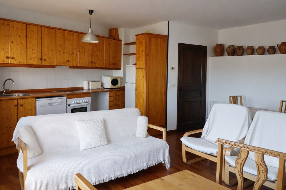 Tot l'apartament té el terra de parquet, que li dóna un ambient càlid i acollidor. Només entrar hi trobem un espai destinat a la cuina i menjador. Una xemeneia presideix aquesta zona d'estar. Més enllà, un petit distribuïdor ens porta a dos habitacions dobles amb bany propi que completen la planta. Una d'elles es pot convertir en triple.