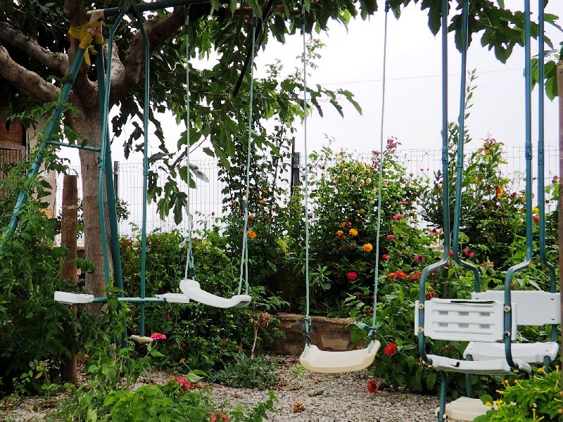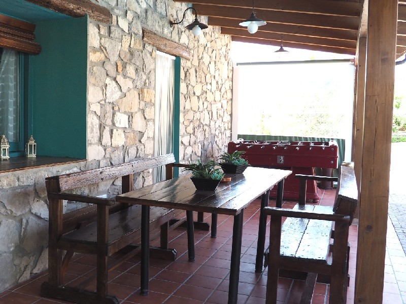 Al jardí hi trobem gronxadors per als mes petits, i també un futbolí. Més enllà hi trobem un porxo amb taules i cadires i la zona de barbacoa amb llenya a disposició i un forn de llenya. També hi tenim l'hort on hi cultivem hortalisses de temporada. Durant la temporada d'estiu també hi posem una piscina ideal per a refrescar-se!