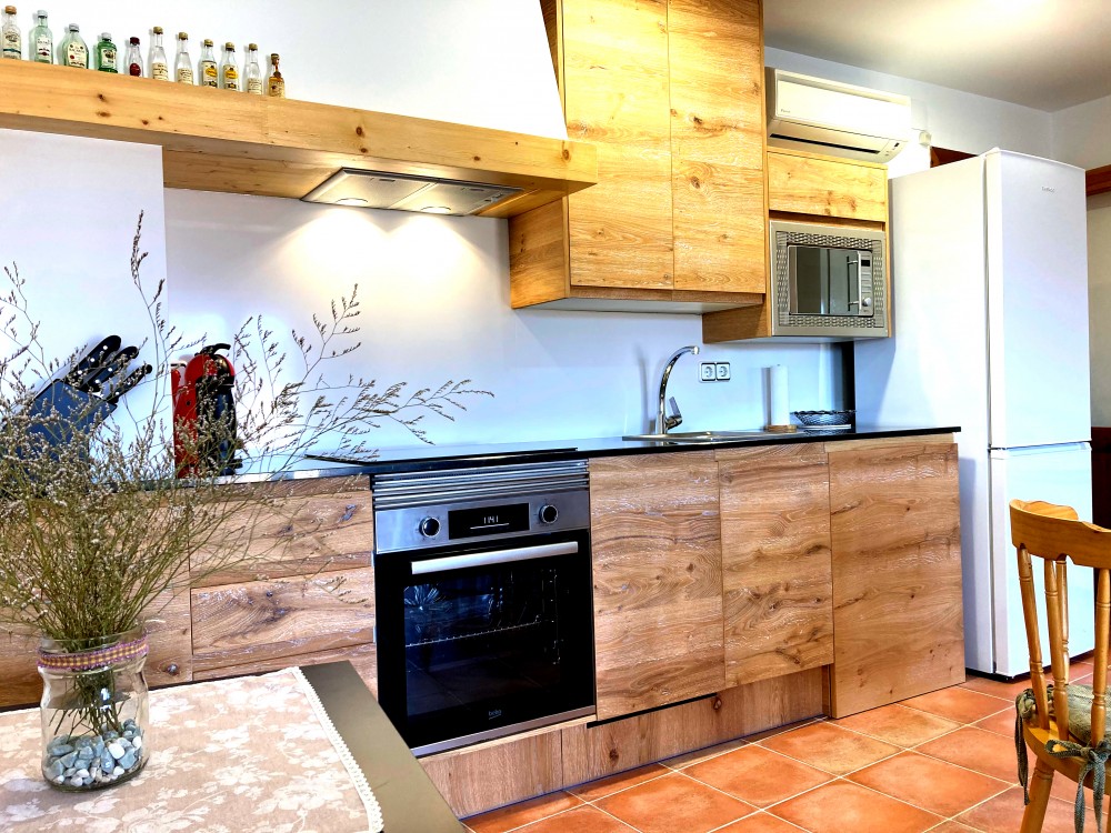 A la sala d'estar-menjador hi ha una taula amb capacitat de fins a 8 persones i un gran sofà llit còmode per als hostes addicionals. La cuina consta amb fogons elèctrics, microones i un forn molt bo a més d'una nevera molt gran.