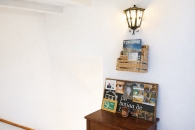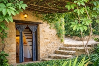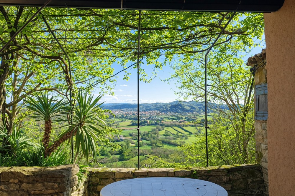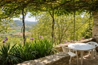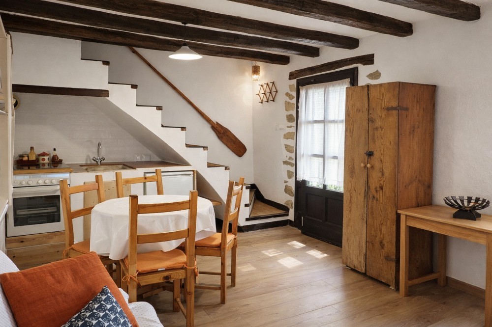 The house is on two floors: The first floor features the living room and a small kitchen with access to the terrace of 15 m2 with garden table and chairs. On the second floor, a room with a double bed, a bathroom and a covered patio with table and chairs which also has access to the street, at the foot of the Castle Square.