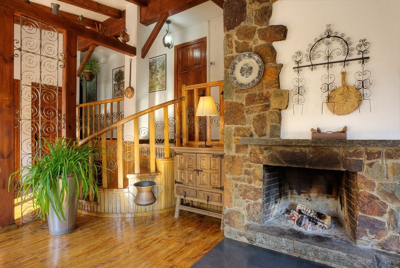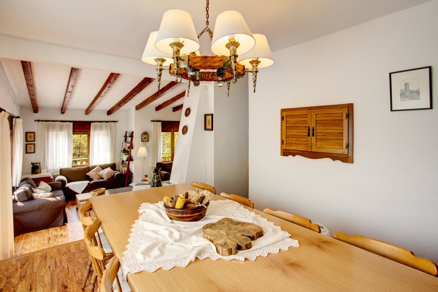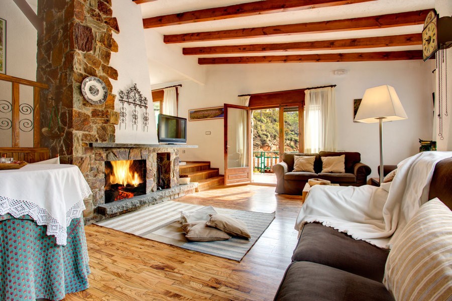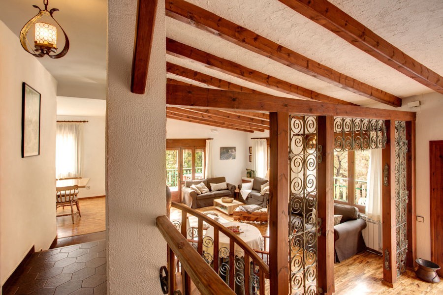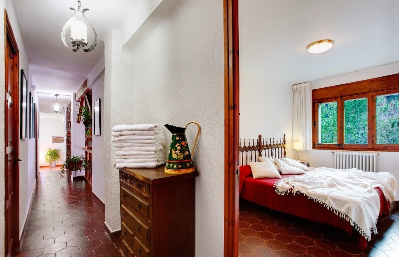 The accommodation has two floors. On the first floor there is a living room with fireplace and access to the terrace that surrounds the property. In this, there are the dining room and fully equipped kitchen with utensils: dishwasher, oven, microwave and all necessary small appliances. We also find three bedrooms and two bathrooms. On the ground floor, there is a bedroom and a bathroom. The four rooms have two double beds (one with private bathroom) and two single beds (double-triple-quadruple) depending on the needs of each group.