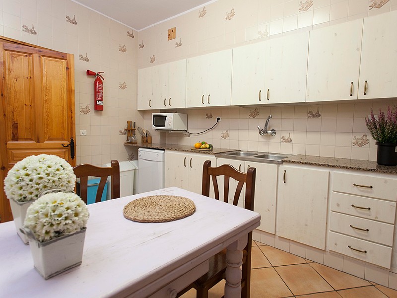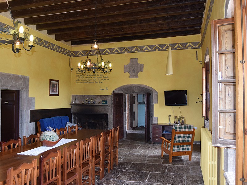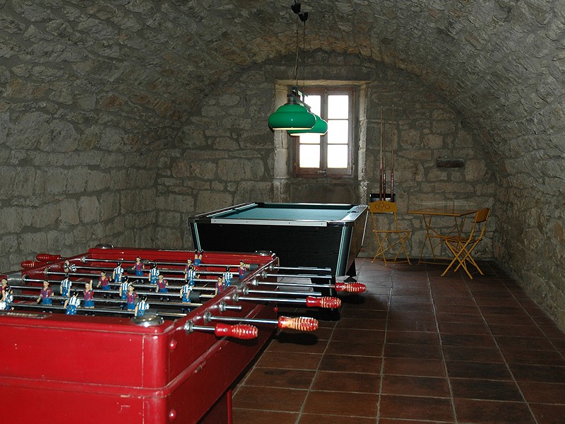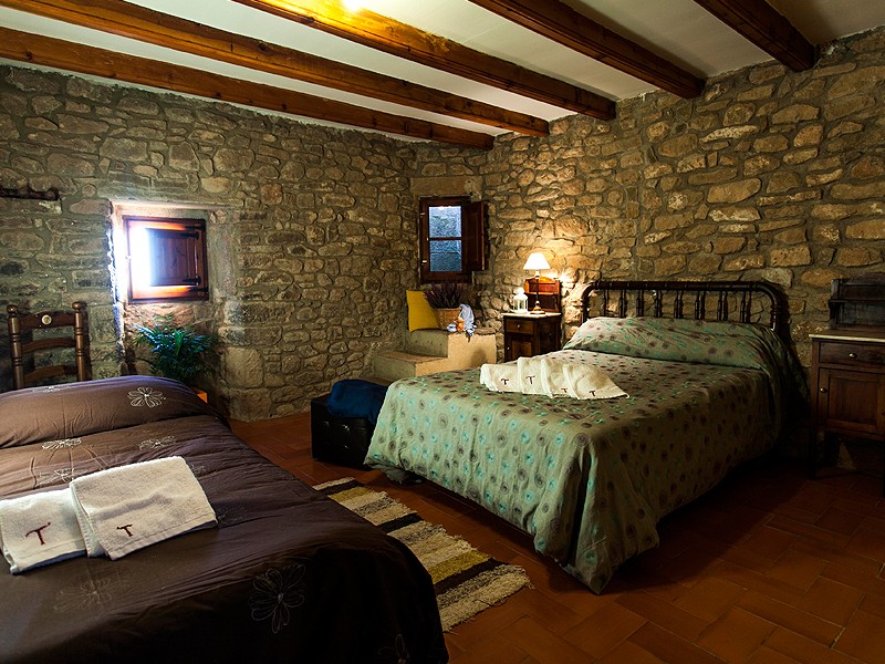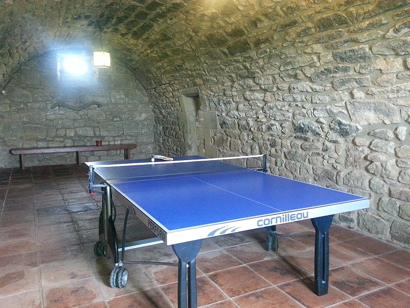 On the ground floor there are the entrance and two rooms where there is the ping-pong, table football and billiards. Up to the stone stairs, on the right, there is a terrace with spectacular views of Solsona equipped with tables and chairs. We entered the house where there are a large living room with sofas and TV, a large dining room with a long table and chairs, the fireplace and TV, two double rooms (shared bathroom with shower), another double room with possibility to become triple, the kitchen fully equipped (fridge, freezer, dishwasher...) and a large bathroom with shower, washing machine, two sinks and washing hands. On the second floor, you will find one triple room with bathroom exclusive in front of, one double room with bathroom inside, one double room with bathroom inside and one room with two beds with exclusive bathroom before. All bathrooms are with shower.