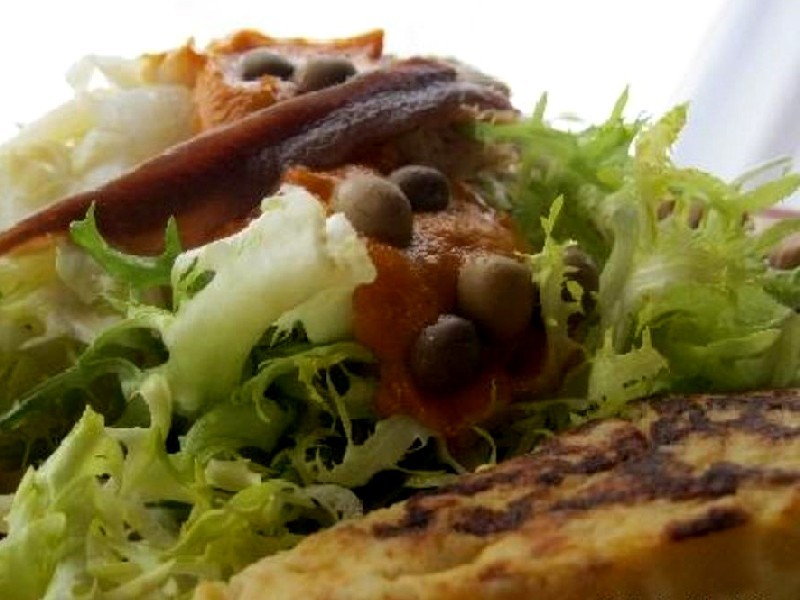 Take a morta, season to taste and mash were one by one, and in this order, almonds, hazelnuts and garlic, until a very fine paste. Then add pepper romesco sauce, fried bread, paprika and white pepper. Finally, tomatoes, oil and vinegar. Once the sauce is mixed with endive well washed and drained. Let stand a few hours.