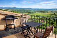Desde la sala comedor accedemos a una habitación doble coronada con un bonito altillo de madera, este altillo es un lugar idóneo para sumergirse en la lectura y dejar viajar la imaginación, y permite, además, la colocación de 2 camas adicionales. Al lado de la habitación un baño completo con bañera y, en frente, una sala de estar con chimenea y una terraza - mirador que ofrece unas vistas maravillosas del valle -. En esta sala hay un sofá que es transformable en una confortable cama de matrimonio, quedando, si se quiere, la sala de estar como una habitación de matrimonio con chimenea y terraza.