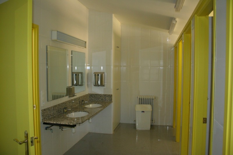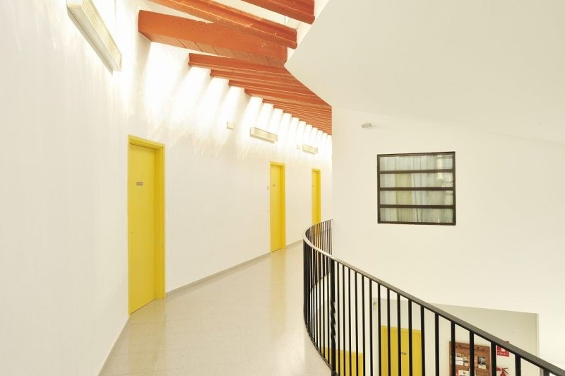 Para subir a la primera planta encontramos unas escaleras muy amplias. En la planta primera se encuentran las habitaciones con ventanas al exterior, todas ellas con literas. También hay una sala de estar con TV y con butacas y sofás. Al fondo de la planta encontramos en dos cuartos de baño, 6 wc y 6 platos de ducha.