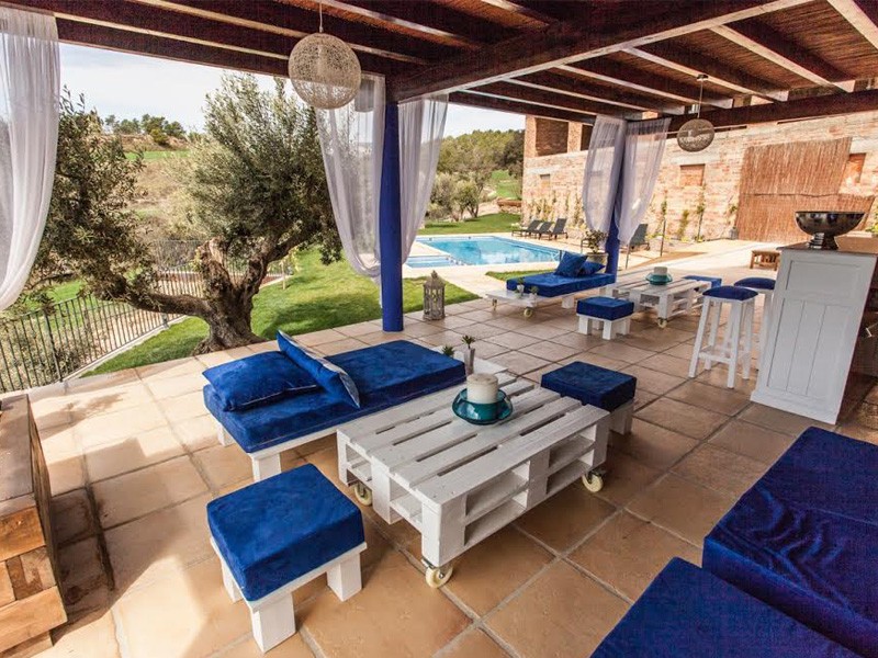 Zona chill-out frente a la zona de piscina con todas las comodidades y una zona de bar