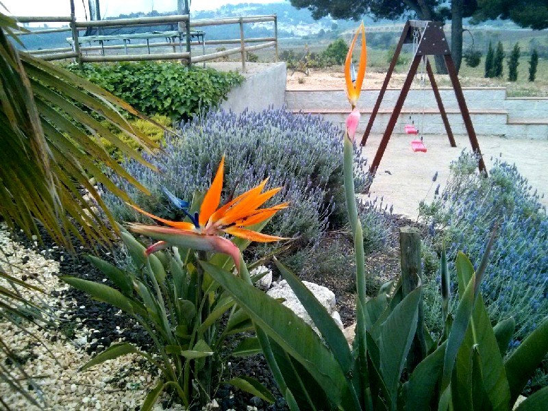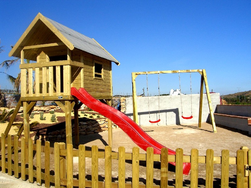 Dentro de la finca también encontramos un parque infantil ideal para los más pequeños con una caseta de madera, tobogán y columpios.