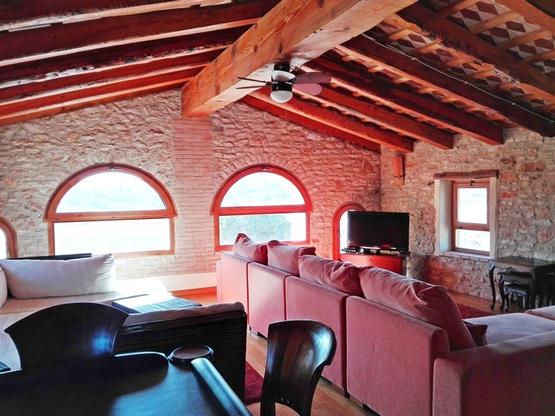 Y desde aquí, subimos unas escaleras para llegar al altillo donde encontramos una sala de estar muy grande con una zona de sofás y TV, y al otro lado una mesa ideal para jugar a juegos de mesa o descansar. Desde esta sala tenemos unas vistas a los viñedos espectaculares!!