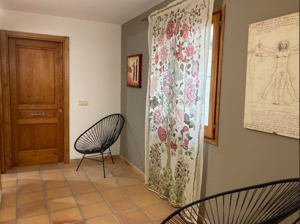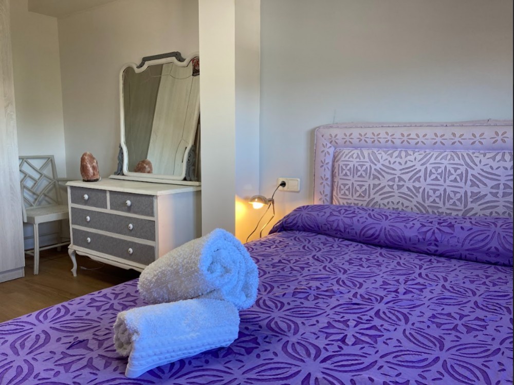 El dormitorio principal es amplio y muy luminoso, con una cama de matrimonio, armario grande, mesitas de noche y un balcón con buenas vistas. La decoración combina elementos rústicos y modernos, creando un ambiente cálido y relajante.