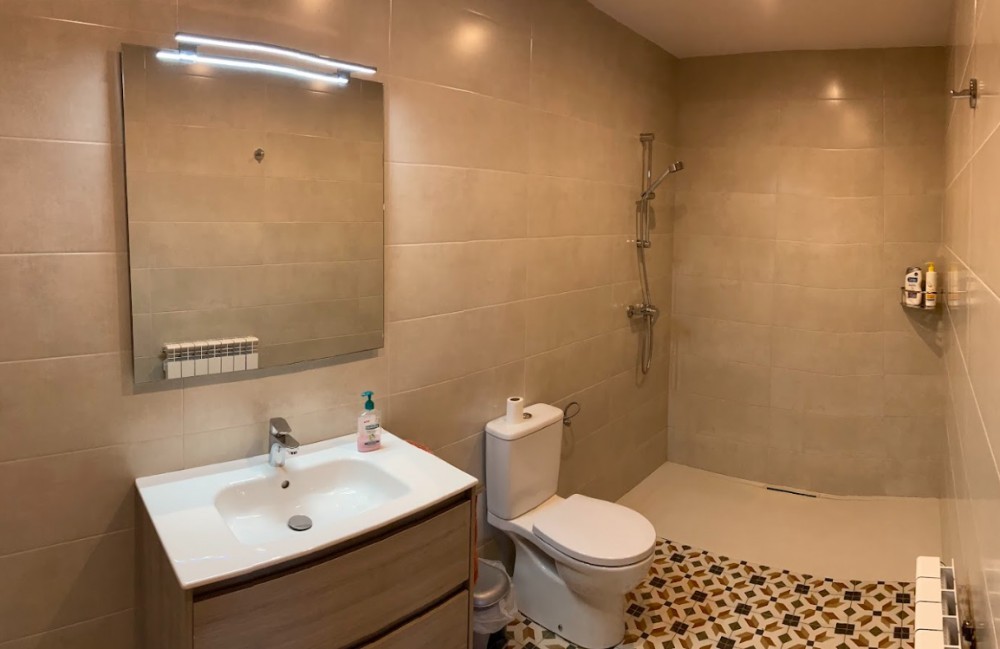 El baño está equipado con una ducha veneciana de grandes dimensiones, acabados de calidad y todas las comodidades necesarias (secador de pelo, estanterías, espejo grande, etc.).